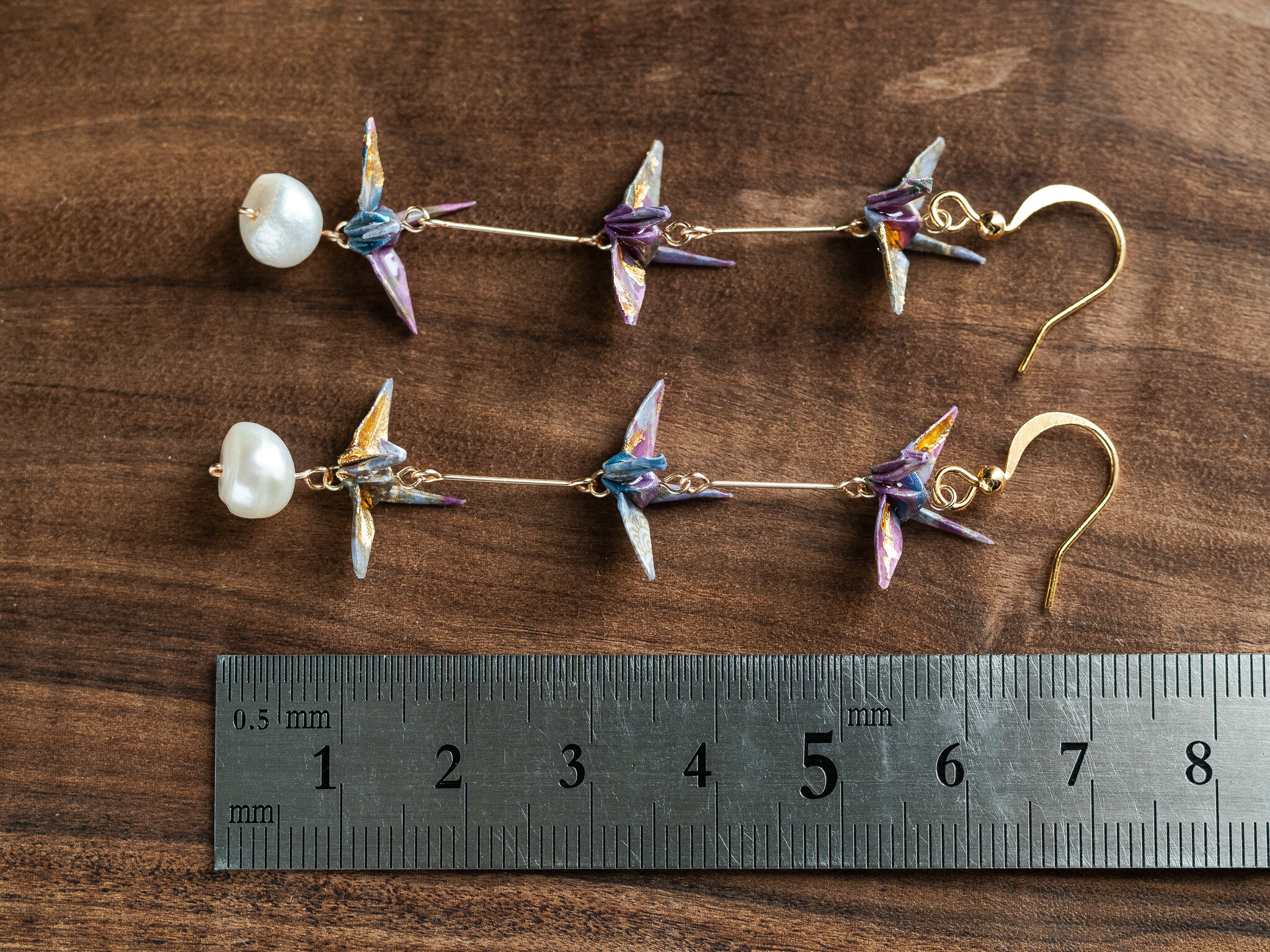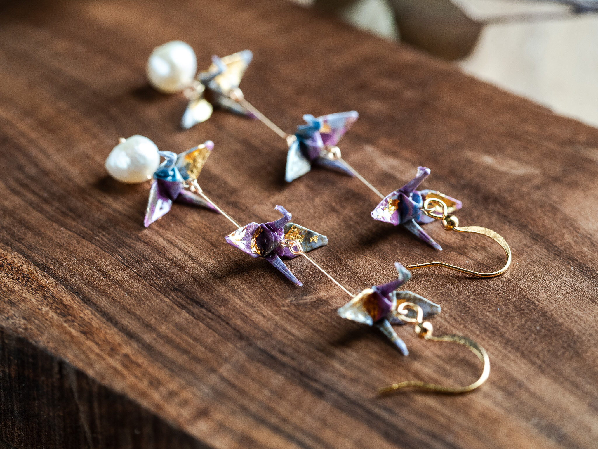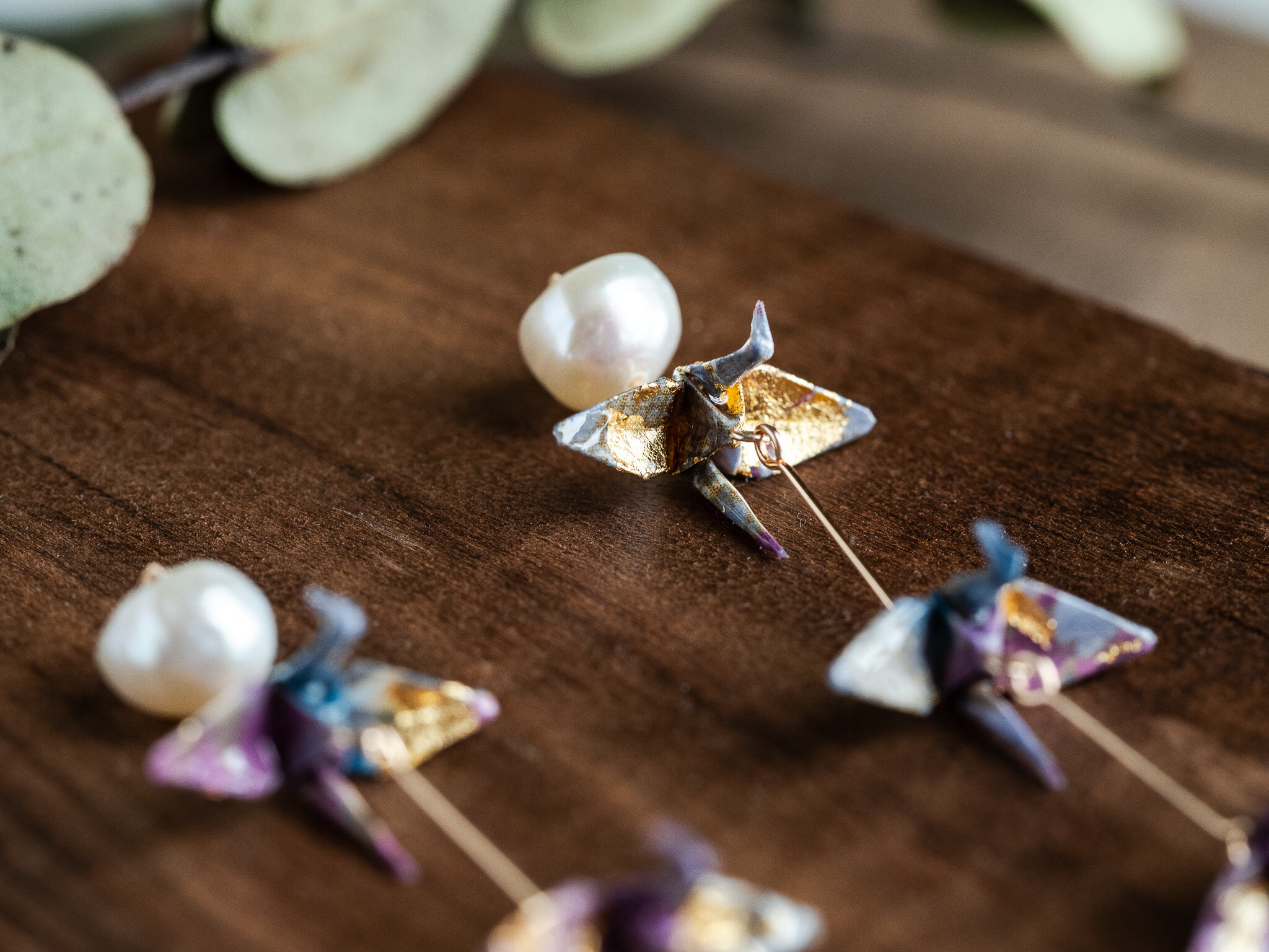 With layers making a nod towards the swooping roofs of Japanese pagodas, these playful orizuru (origami crane) earrings are inspired by childhood memories of warm summer nights. From twinkling stars, joyous festivals, and quiet moments spent with family, each of these cranes is filled with love and nostalgia. Adorn yourself with the joys of summer, and wear a touch of love close to your heart.
