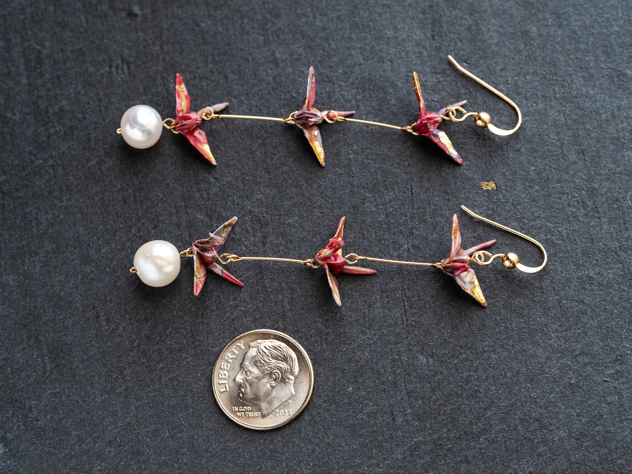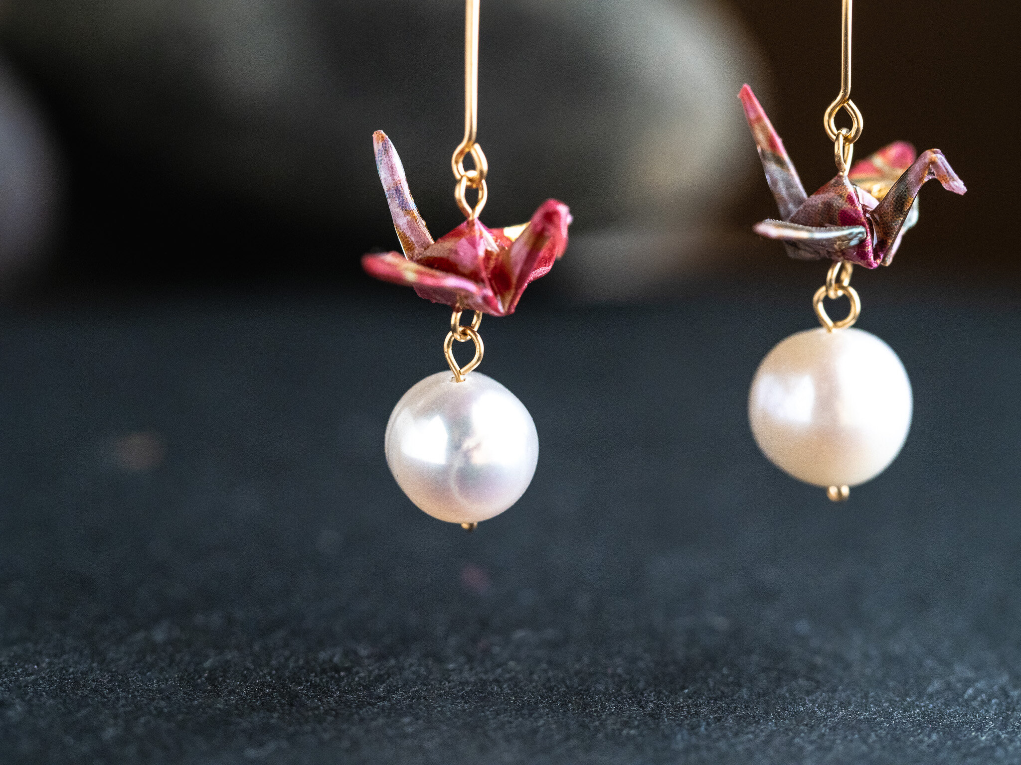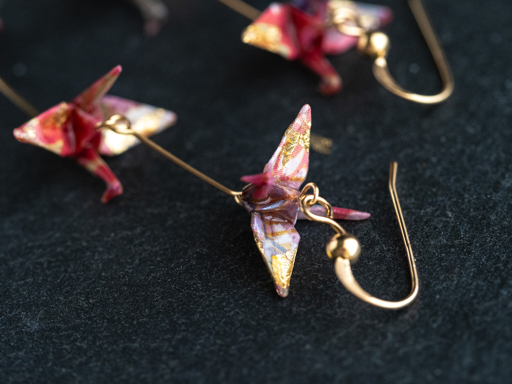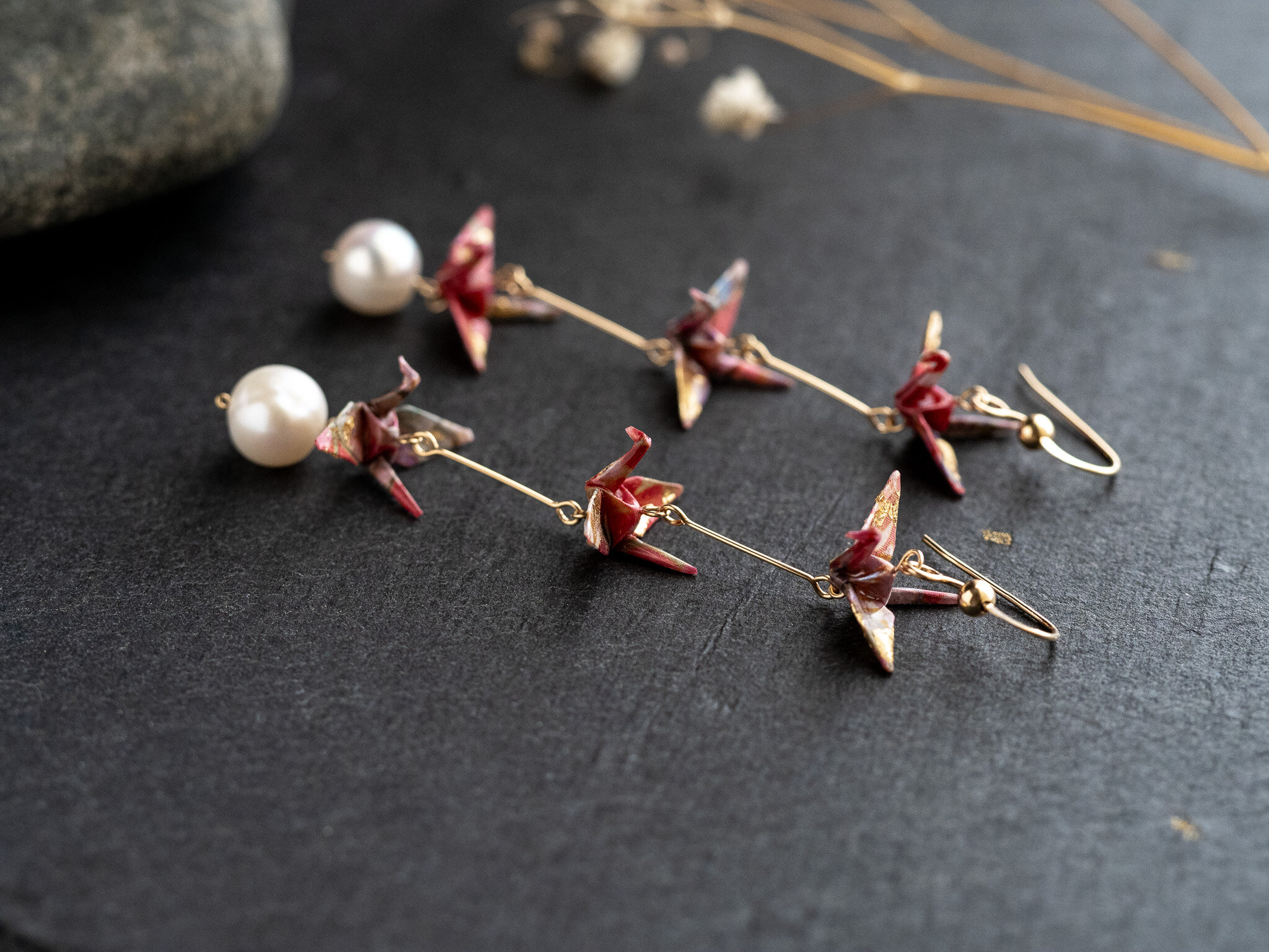 With layers making a nod towards the swooping roofs of Japanese pagodas, these playful red orizuru (origami crane) earrings are inspired by childhood memories of warm summer nights. From twinkling stars, joyous festivals, and quiet moments spent with family, each of these cranes is filled with love and nostalgia. Adorn yourself with the joys of summer, and wear a touch of love close to your heart.